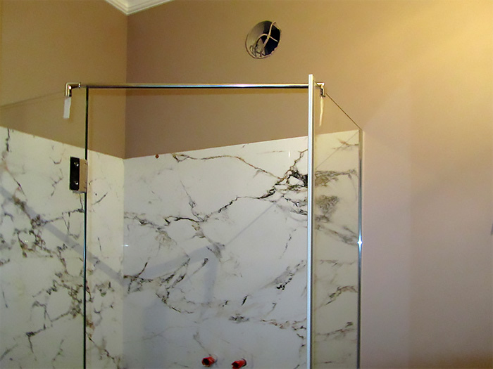 Углы душевой кабины нестандартные и несмотря на это нам удалось, используя немецкую фурнитуру сделать соединения между стеклами и дверью надежными и герметичными.