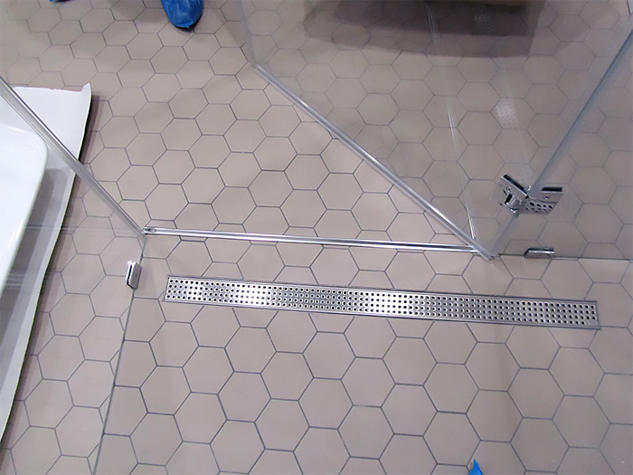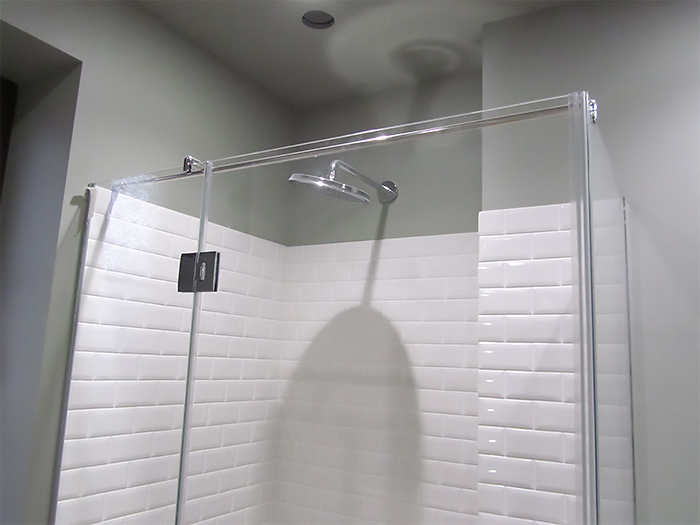 После проведения замеров, мы в соответствии с технологией подготовили стекла и подобрали всю необходимую фурнитуру. Угловая душевая кабина будет состоять из трех листов стекла, два из которых будут неподвижно закреплены на стенах. Из третьего листа стекла мы смонтировали душевую дверь.