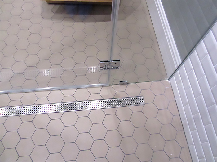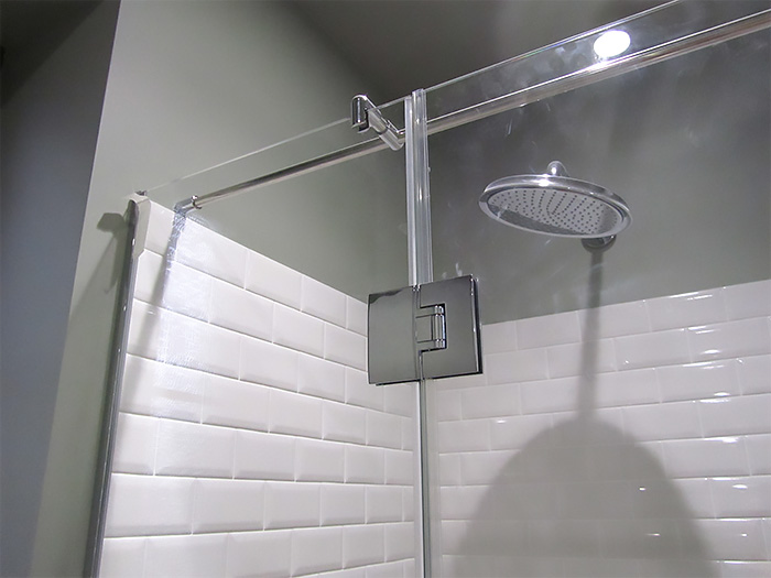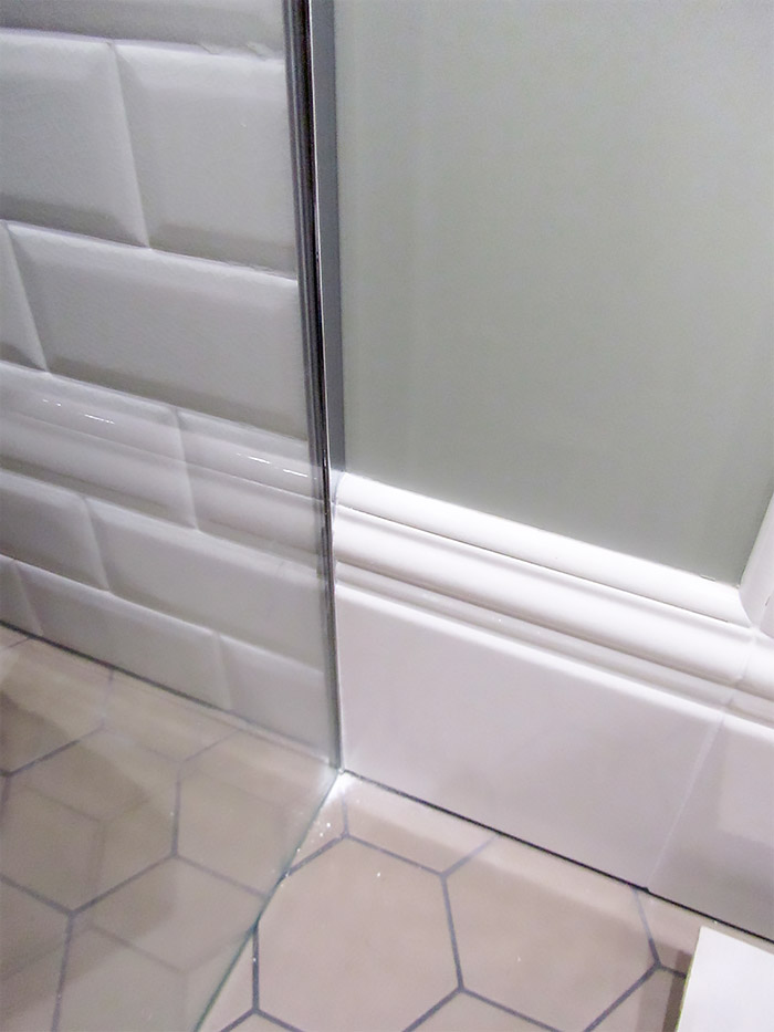 Неподвижные стекла мы закрепили на стены под углом 90 градусов во влагостойкий П-профиль. Технологический зазор, размером в 2 мм между плиткой и полосой П-профиля был замаскирован затиркой, которая использовалась при заделке швов плитки в зоне душа. На данном объекте была применена влагостойкая затирка, в составе которой есть клей. Сам П-профиль закреплен к стене винтами и силиконом. Таким образом мы добились максимальной герметичности и эстетичности данного соединения.